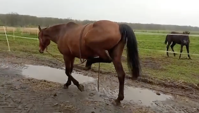 Koń z kogucim chodem, który ujawnił siępo urazie.